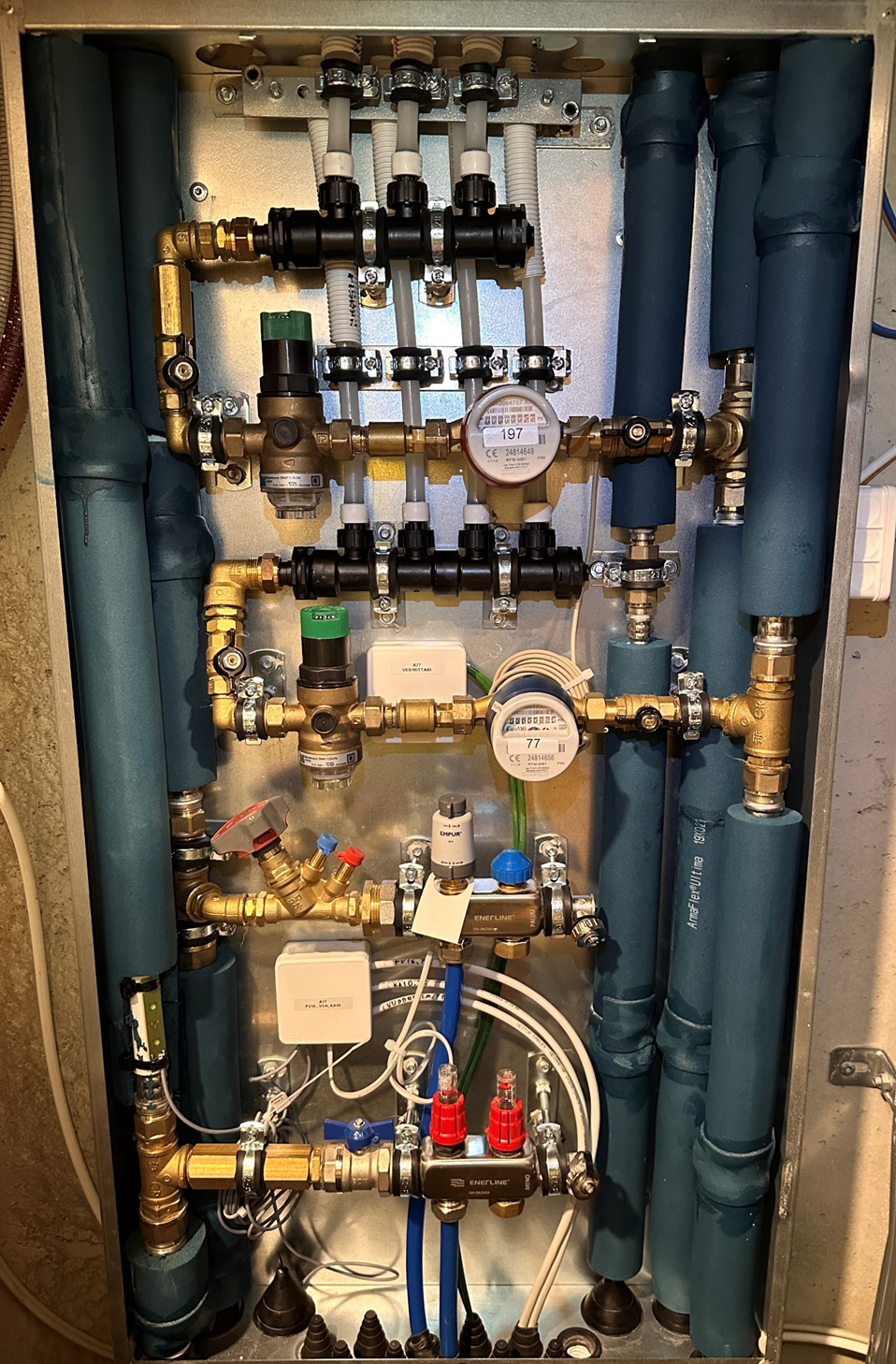 - Huoneistokohtainen käyttöveden jakelu, kylmä- ja lämmin vesi