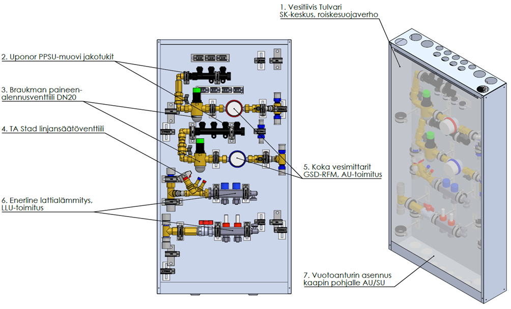 Tulvari SK-kaappi toimitettiin moduulitehtaalle esivalmistettuna, kaappi sisältää: