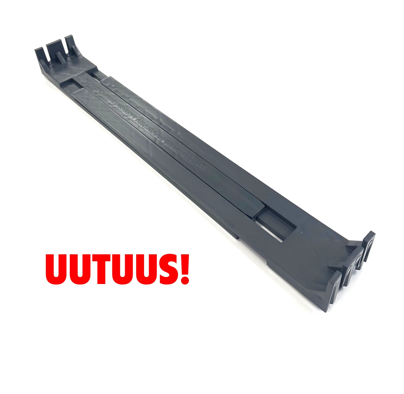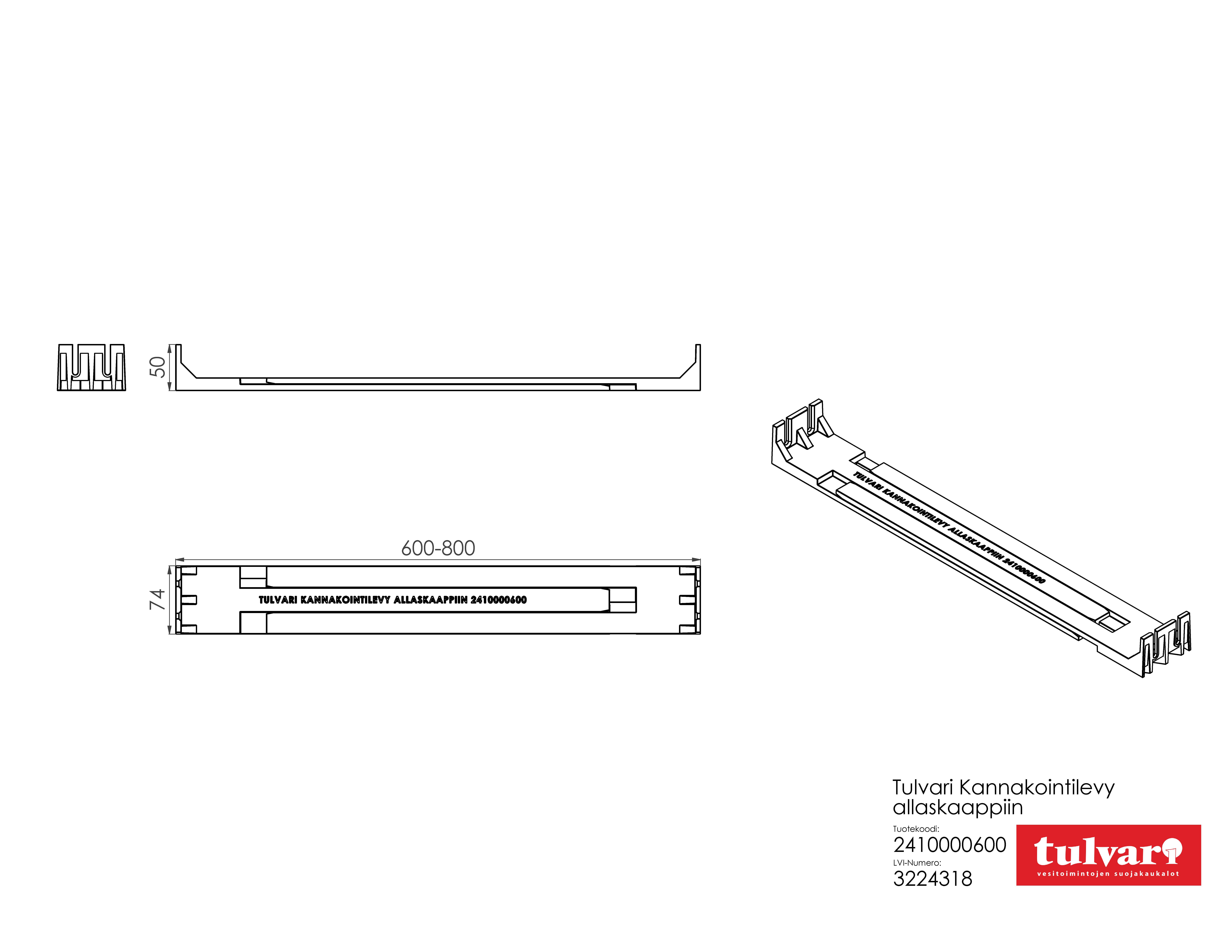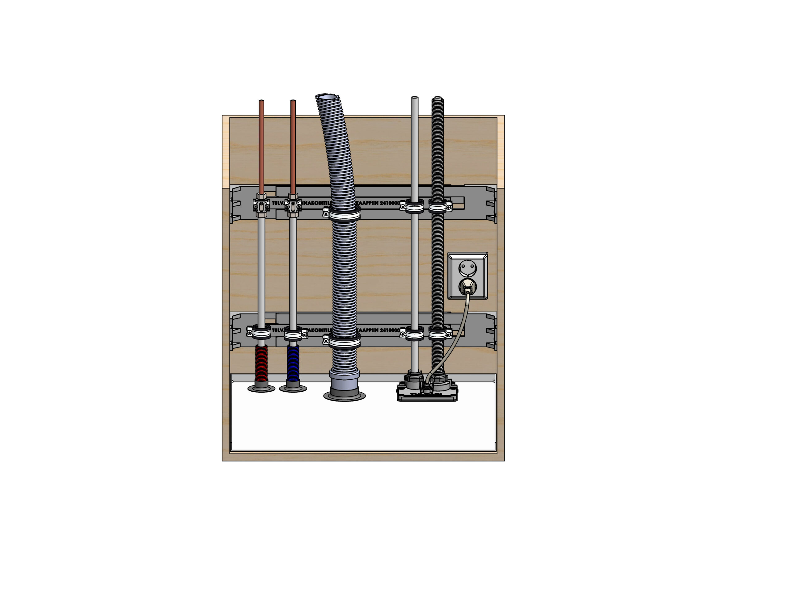 Allaskaappiin asennettavien putkien kannakointilevy. Putket kiinnitetään kannakkein kannakointilevyyn, eikä kannakeita tarvitse kiinnittää pinkopahvin takana olevaan seinään tai kylpyhuoneessa kaakeliseinään. Kannakointilevyssä on leveyden säätö, jonka ansiosta se sopii 550-800mm kaappeihin ja lyhentämällä jopa 300mm kaappeihin. Asennus on optimoitu 600mm kaappeihin.